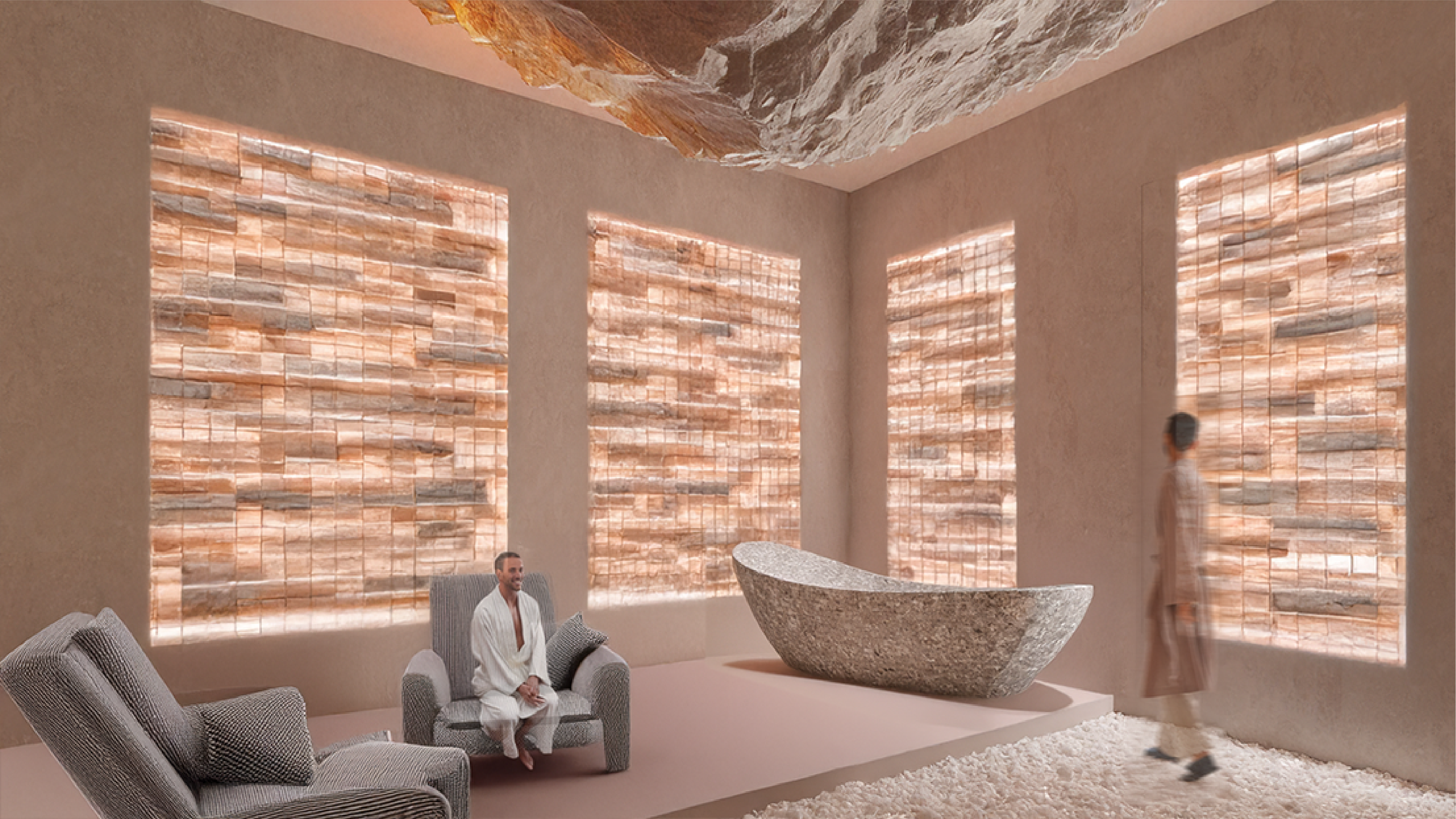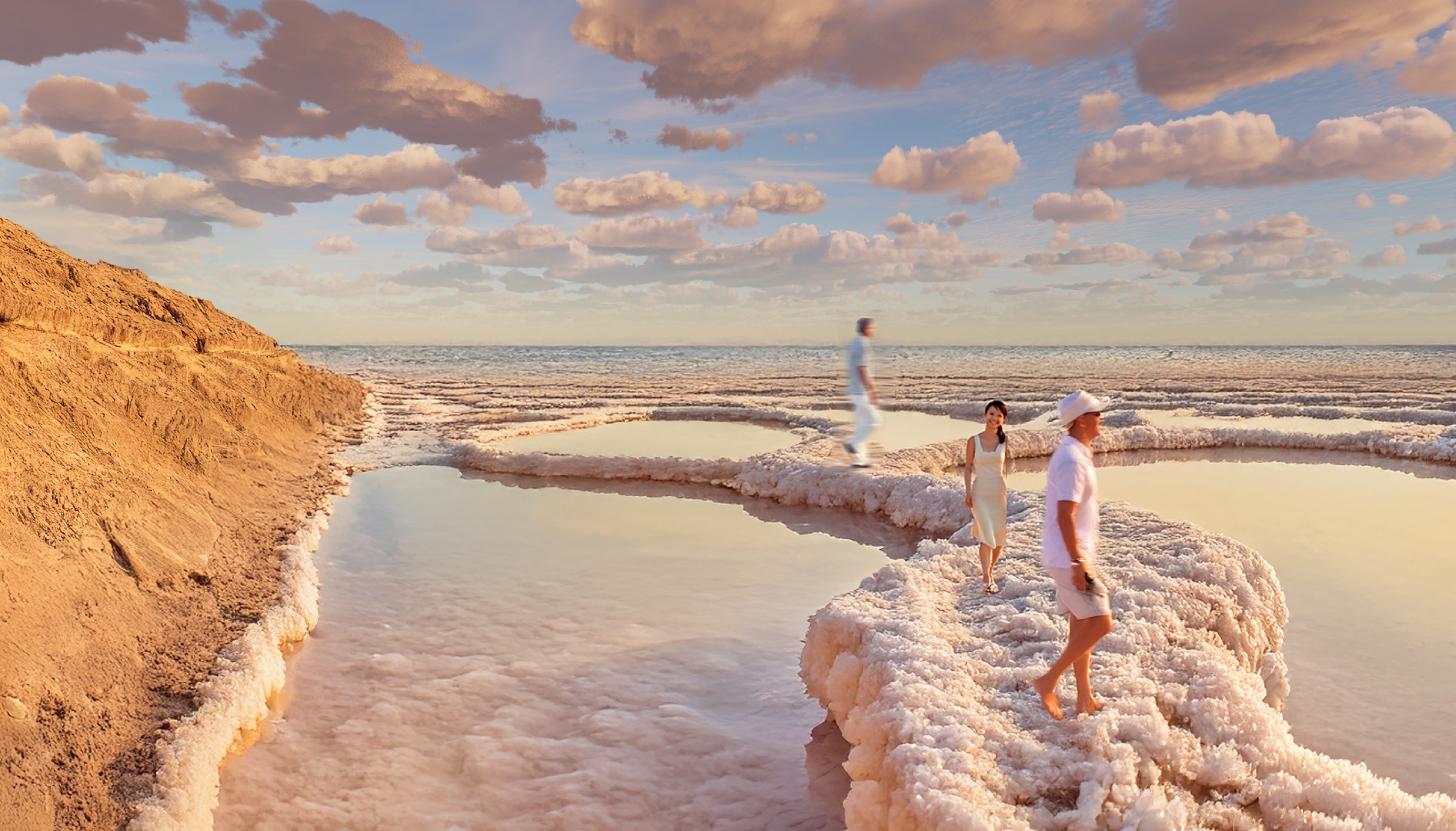 The resort offers a hotel and guest rooms that float above the sinkholes and the Dead Sea and include scenic walking trails made of salt crystals, as the hotel's main attraction for wandering and walking along and inside the sinkholes.