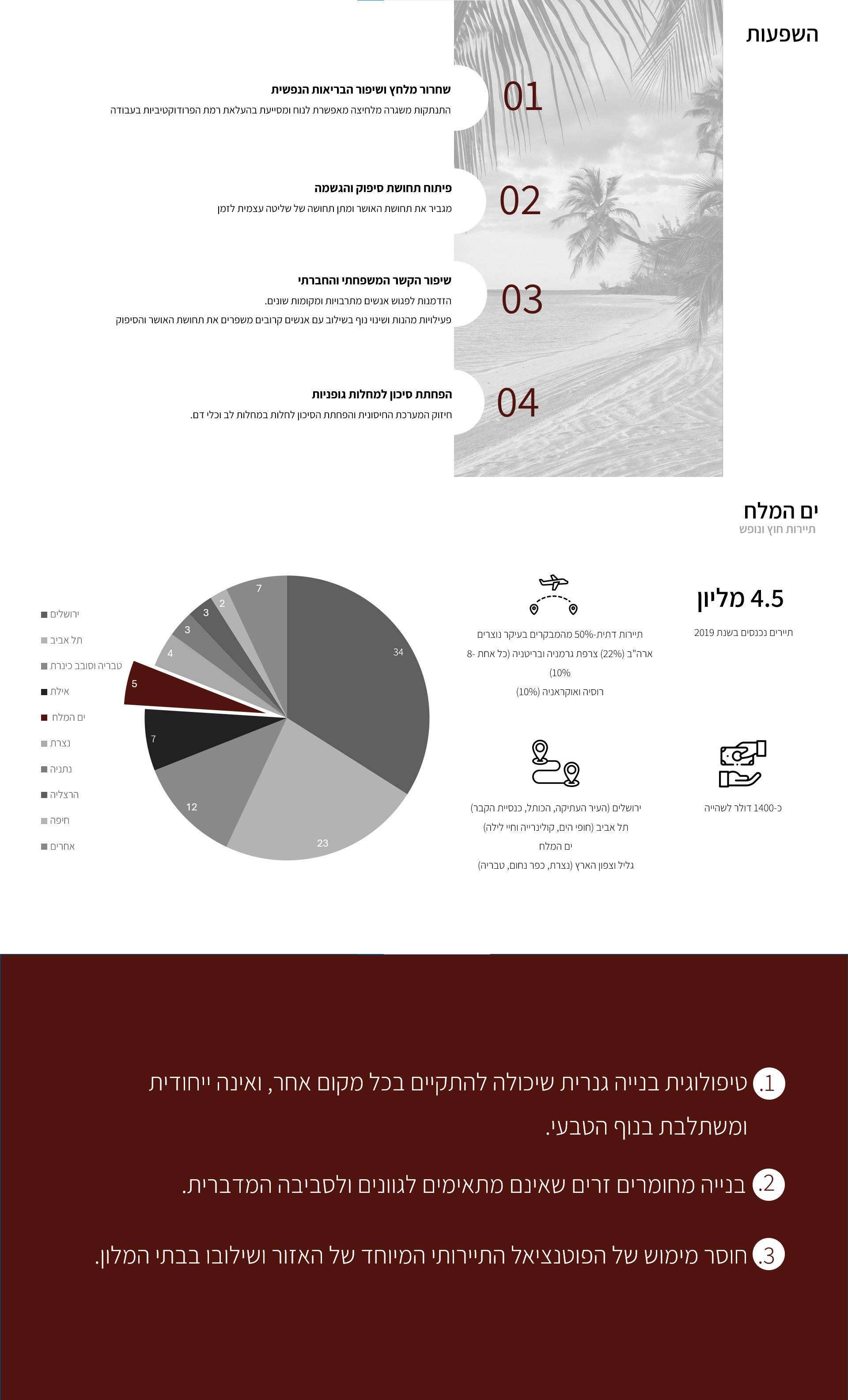 The hotel also offers a health and healing center for vacationers and, among other things, a major scientific research center for studying the Dead Sea and the sinkhole phenomenon.