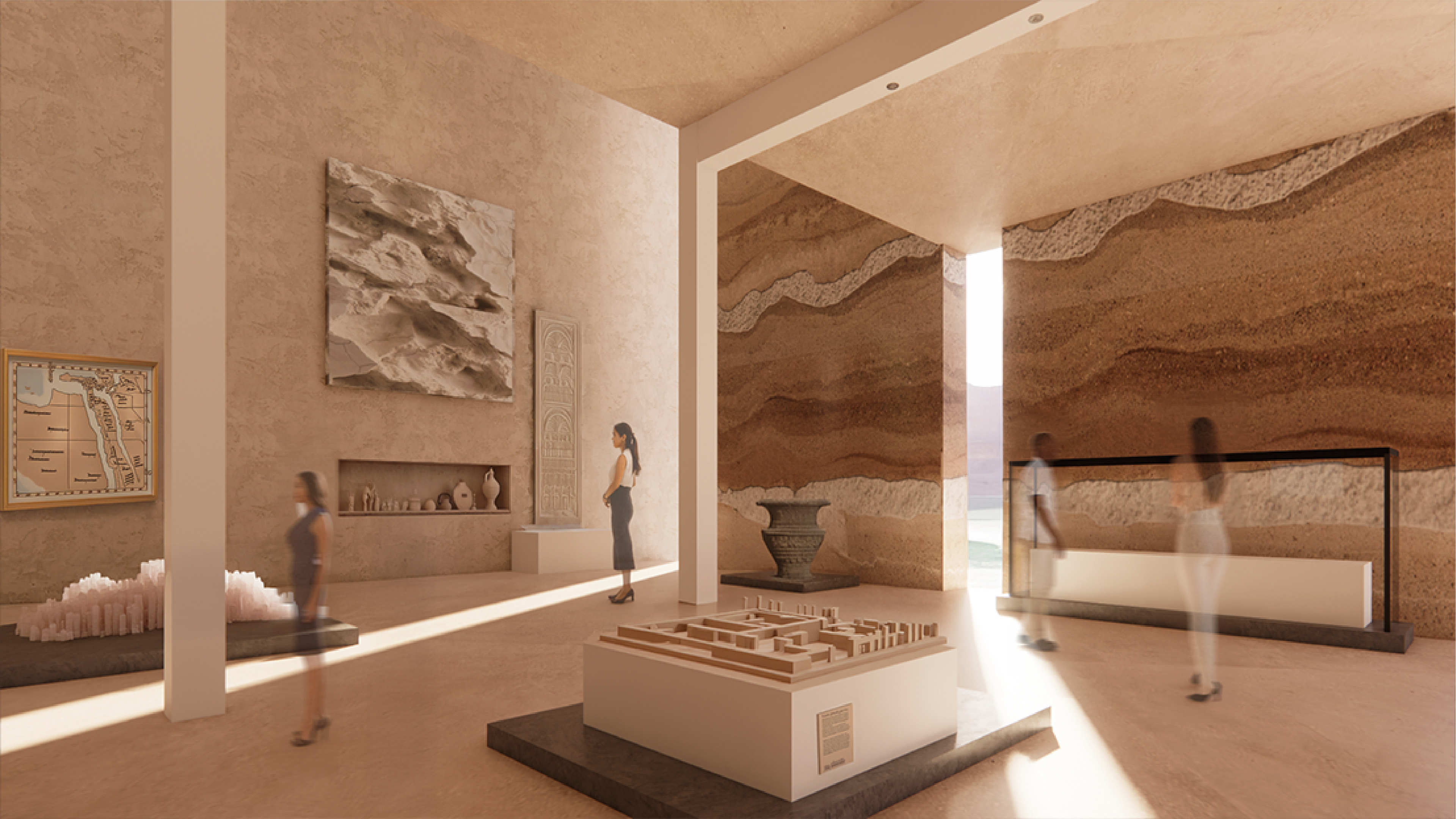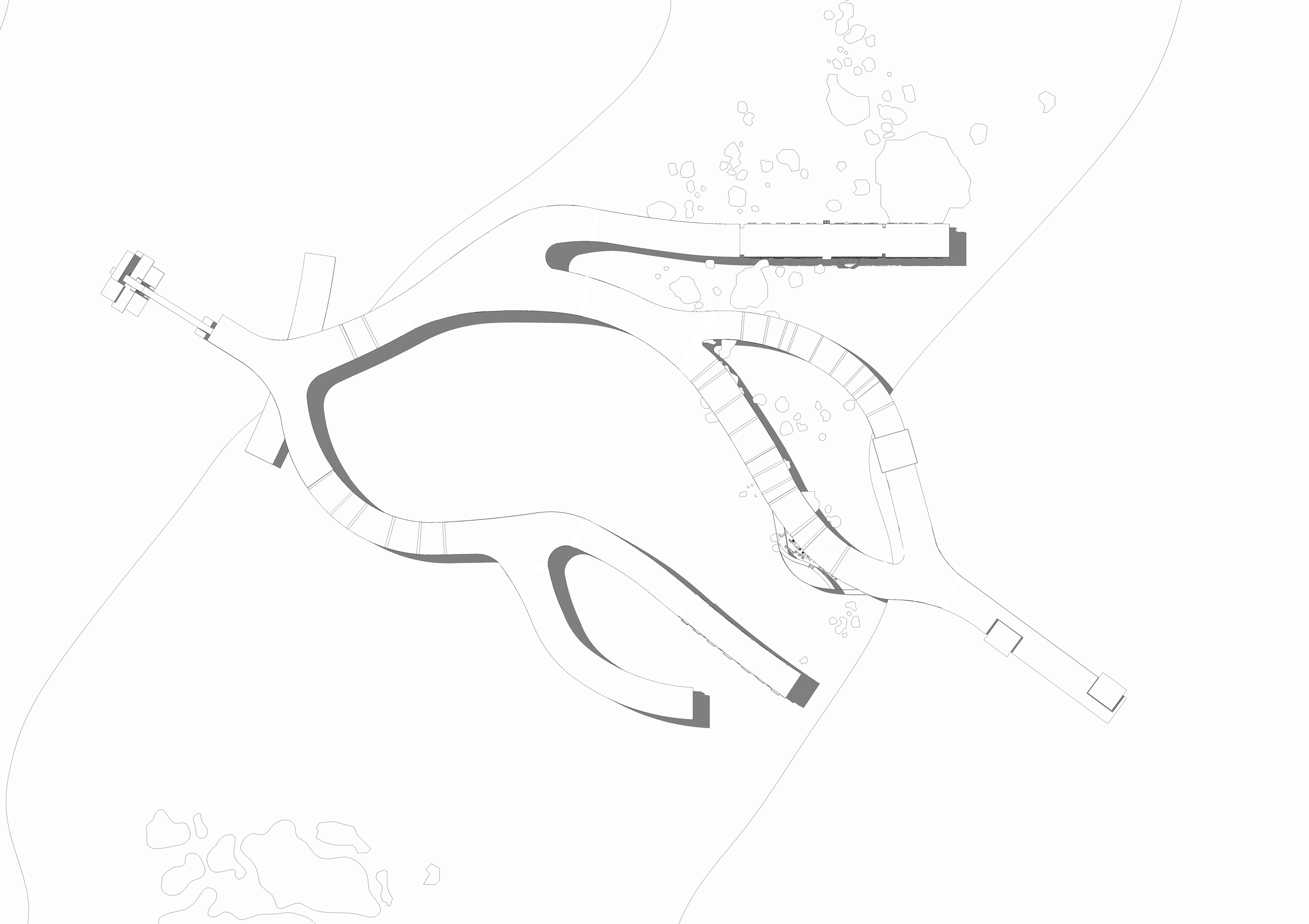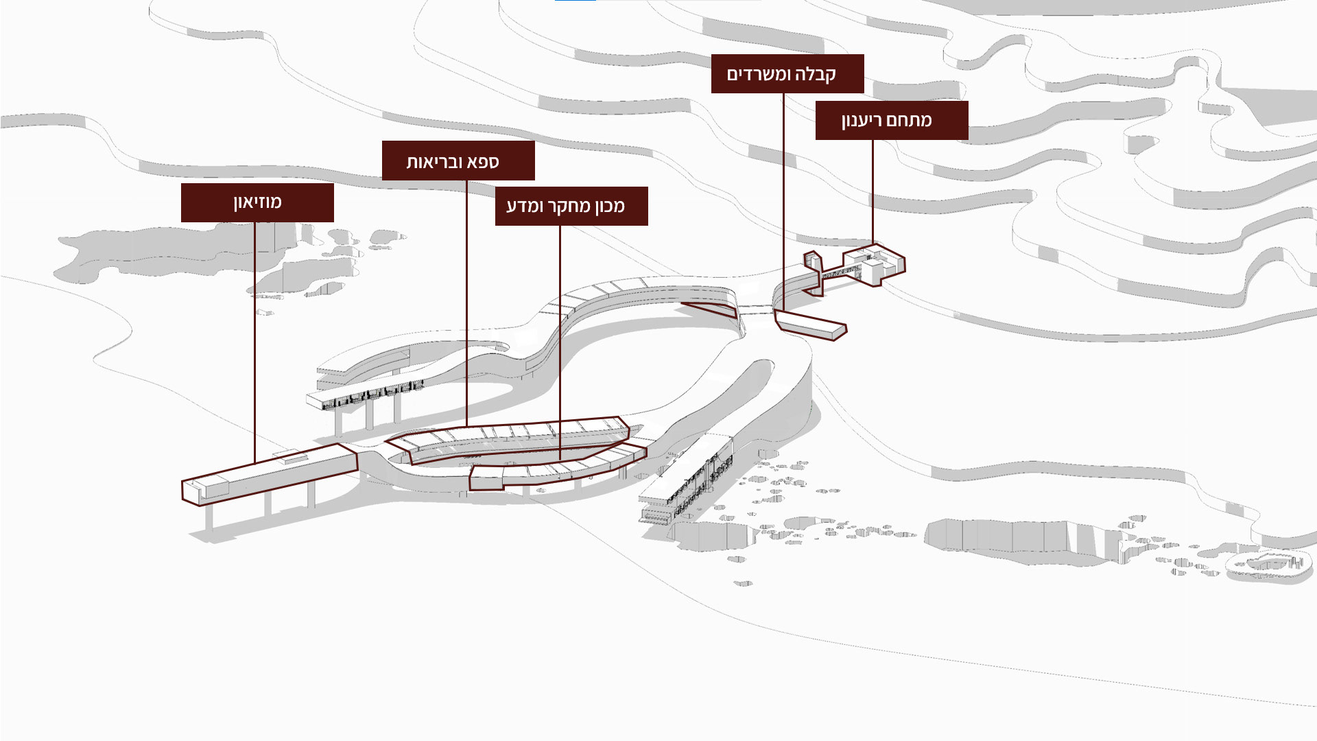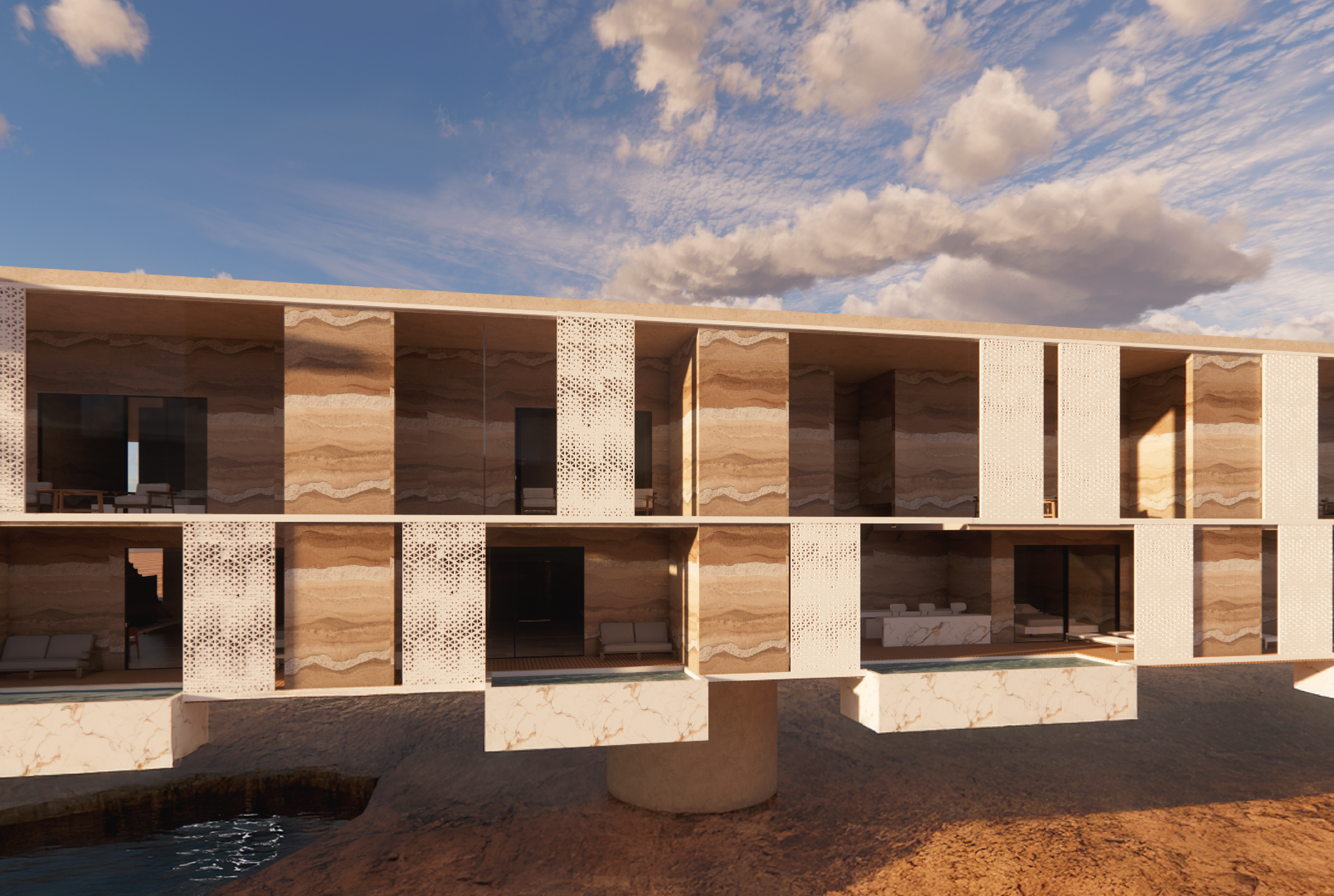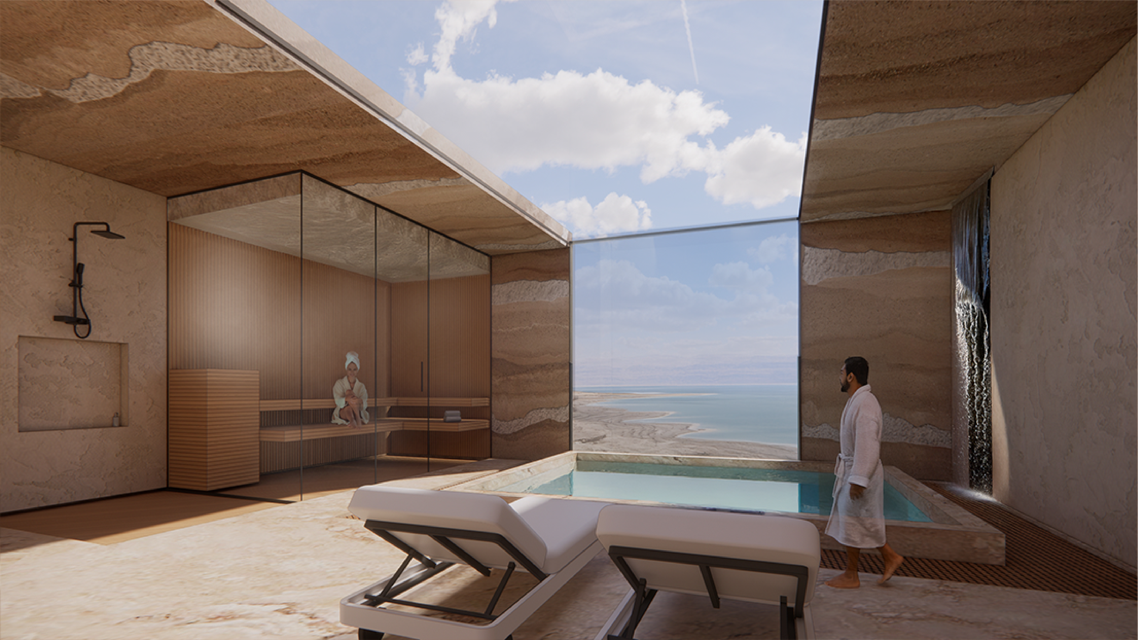The hotel hovers above the sinkholes and the Dead Sea and functions as a winding bridge structure with many levels. In addition to recreation rooms, the building also contains various public functions and attractions for strolling and walking alongside the sinkholes.